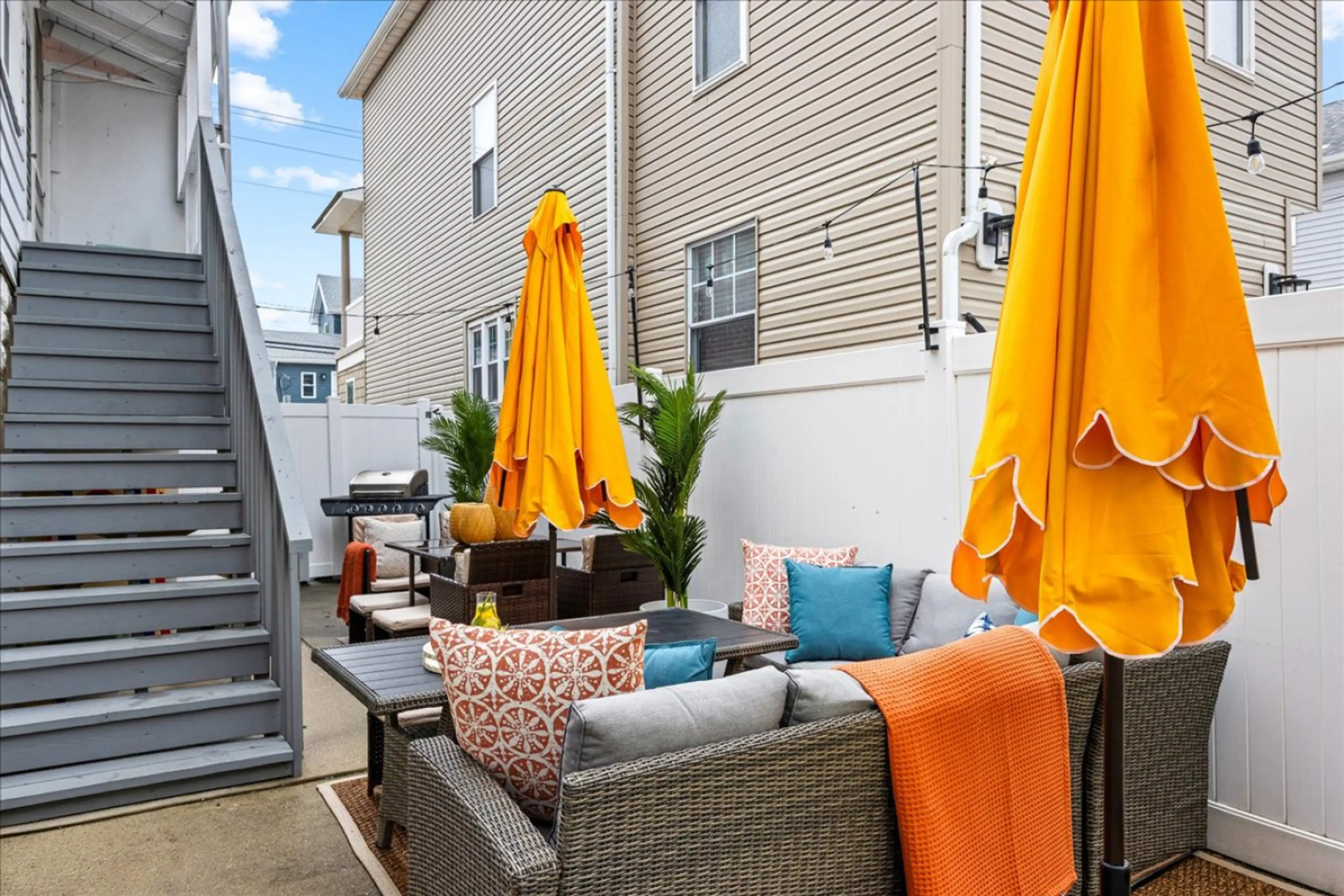 Spacious beach retreat ideal for families or groups! This home combines two units: a 2BR/1BA downstairs with kitchen, living room & washer/dryer, and a 3BR upstairs with kitchen, living room & dining room. Enjoy the private outdoor space with enclosed hot outdoor shower, lounge seating, dining table...